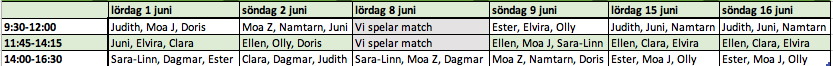 Helgen den 15/16 är inte helt spikat då några tjejer spela ö-bollen med 07:orna och en hel bunt är på scoutläger. Detta innebär också att några får nått mer pass än andra.